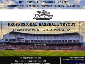 The Grand Prairie AirHogs have scheduled their 2015 Open Tryouts for Saturday, May 9 at 10:00am at the Ballpark at Grand Prairie. The tryout will be conducted by AirHogs manager Eric Champion along with coaches and players.Registration will begin at 9: